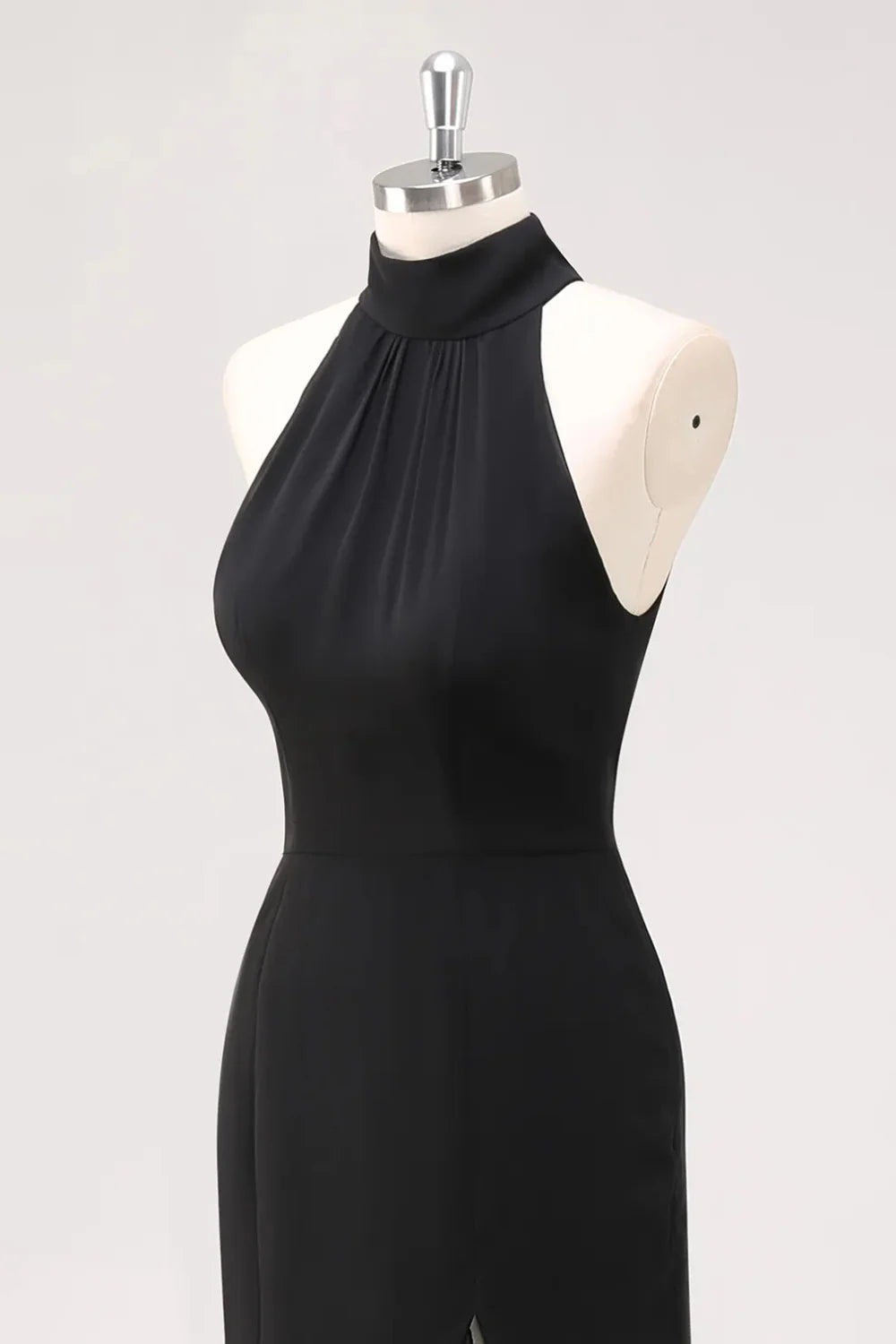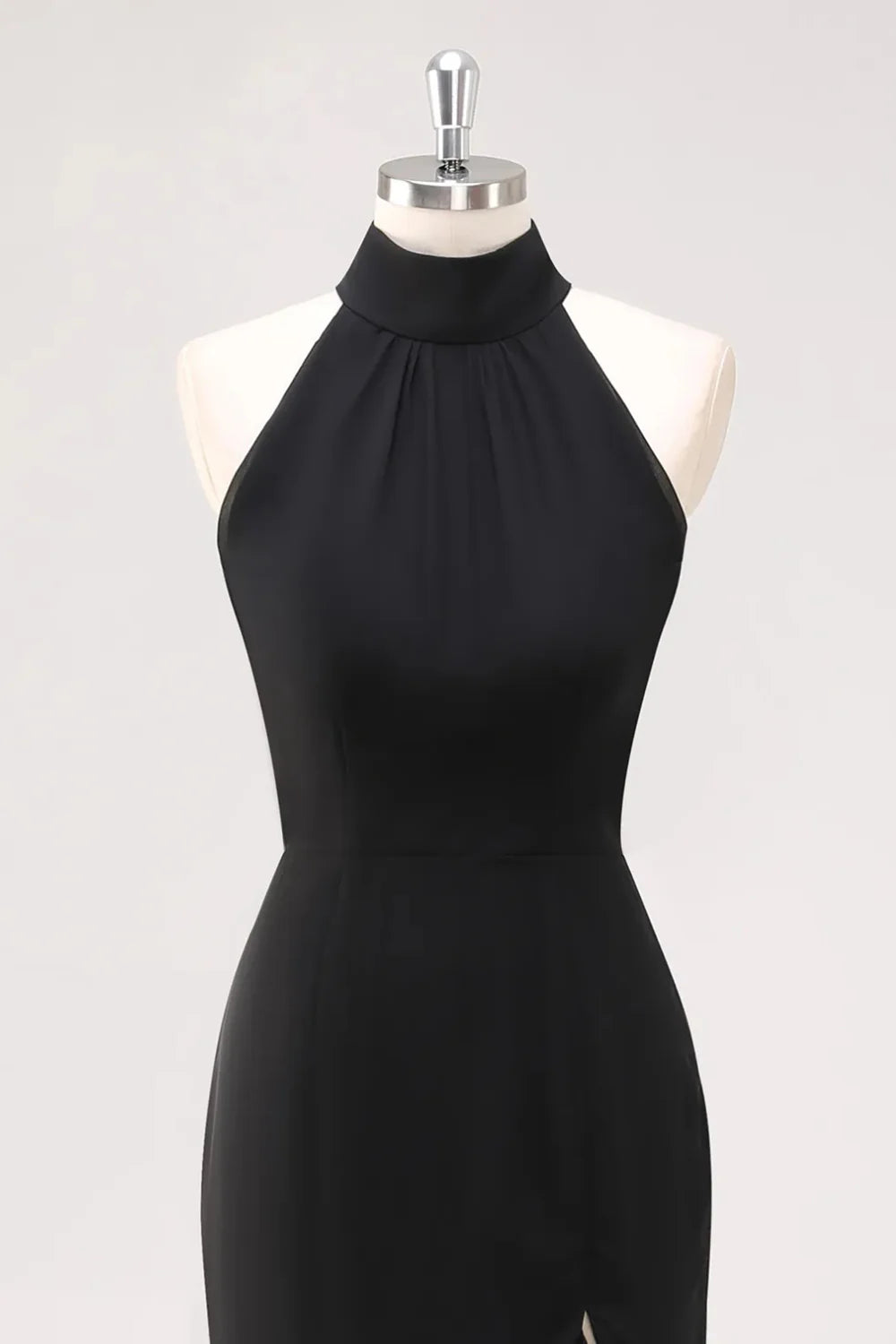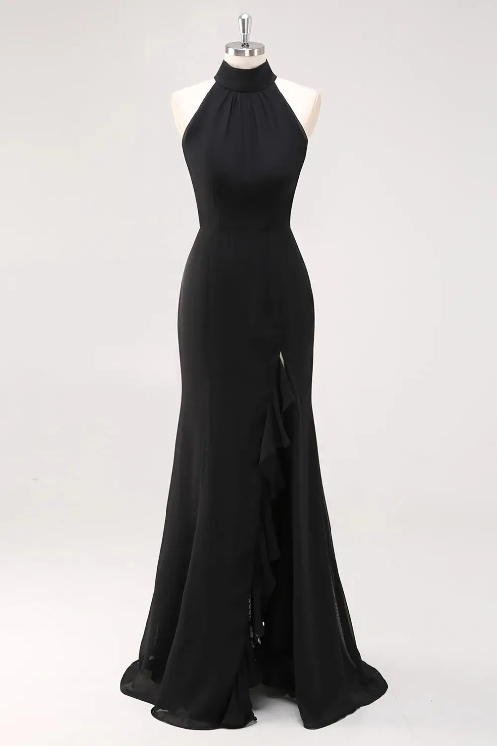 Czarna Sukienka Syrenka z Halterem i Falbanami Długa Sukienka wizytowa z Rozcięciem