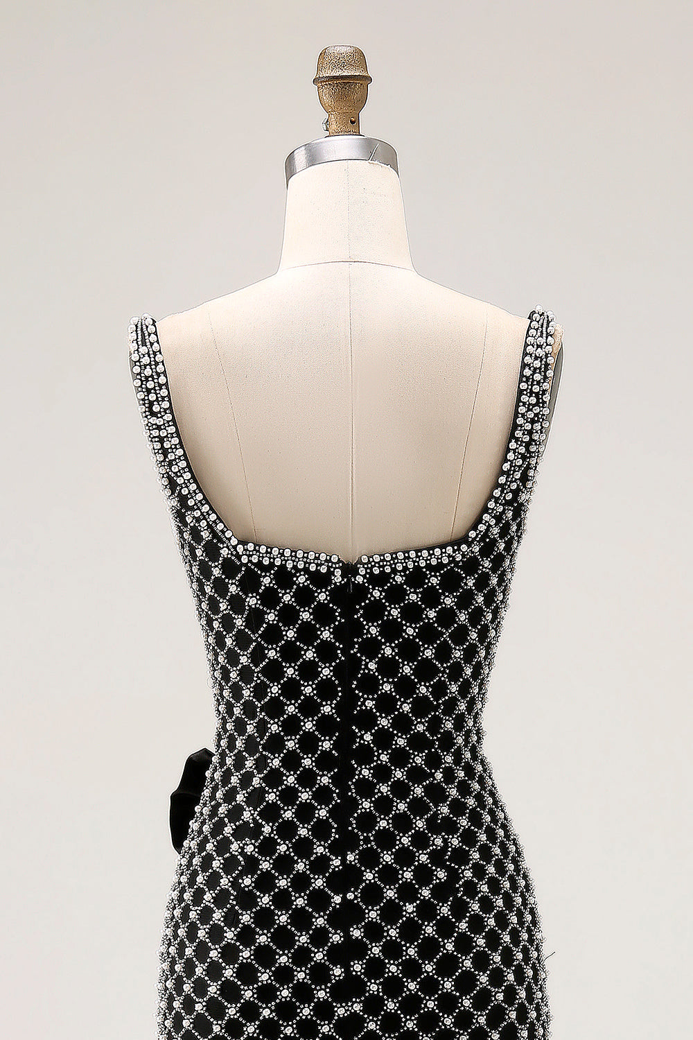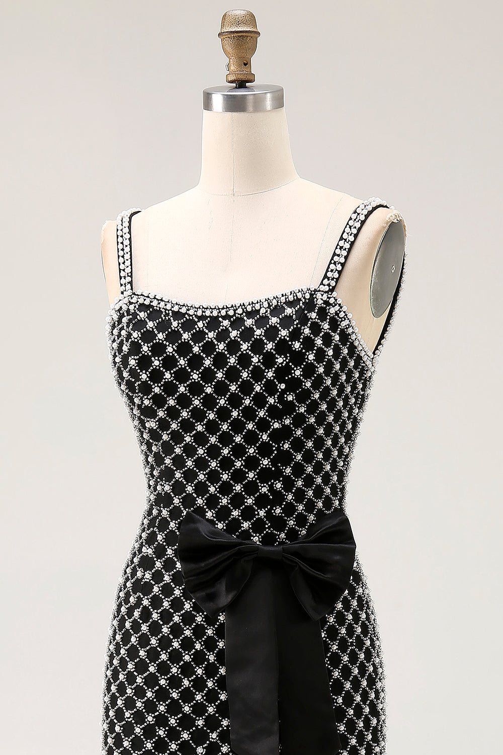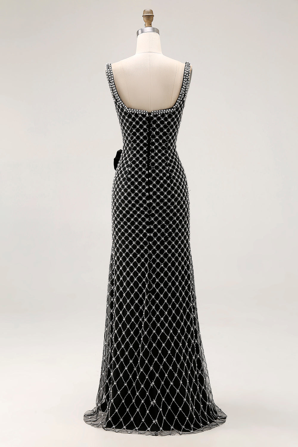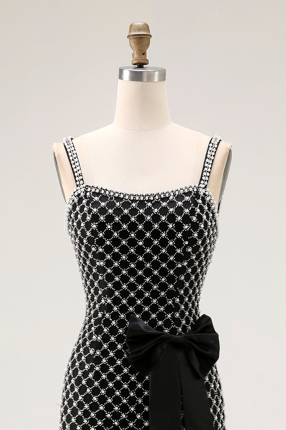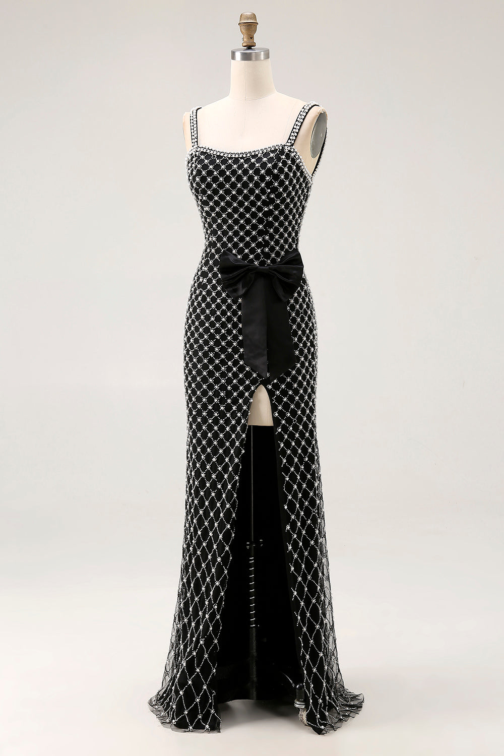Czarne Koraliki Syrenka Spaghetti Ramiączka Długa Sukienka Na Studniówkę Z Rozcięciem