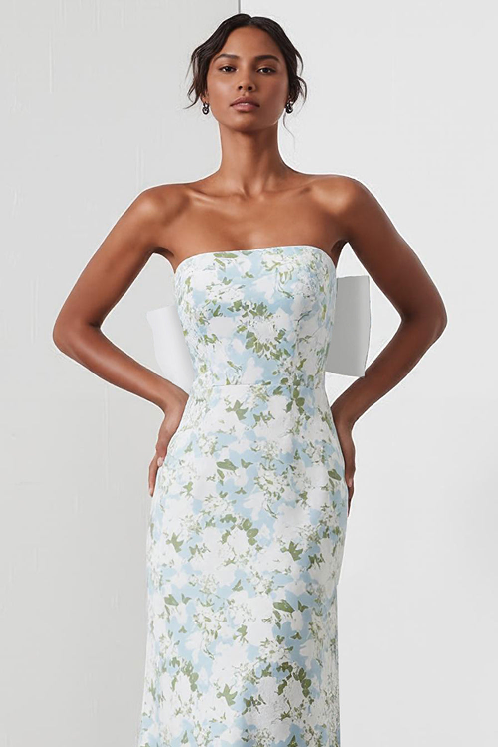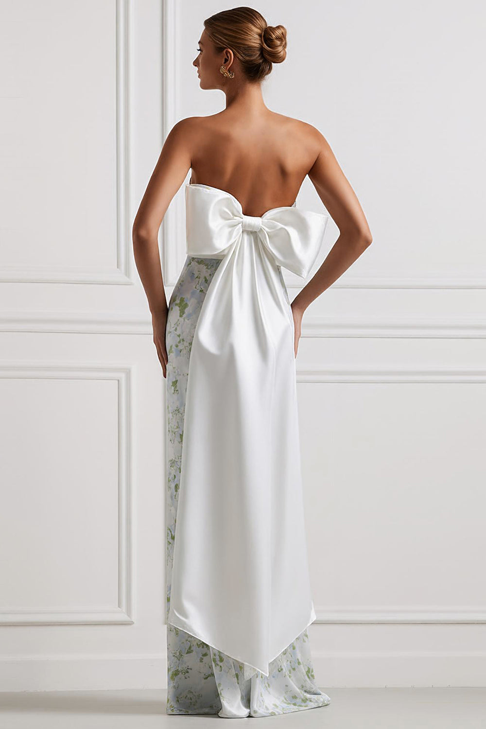 Płaszczowa bez ramiączek Niebieska biała satynowa Sukienka Na Studniówke z kokardą z tyłu