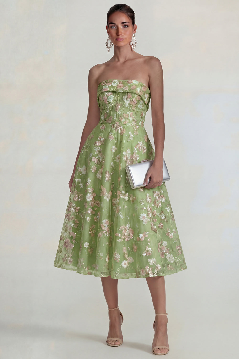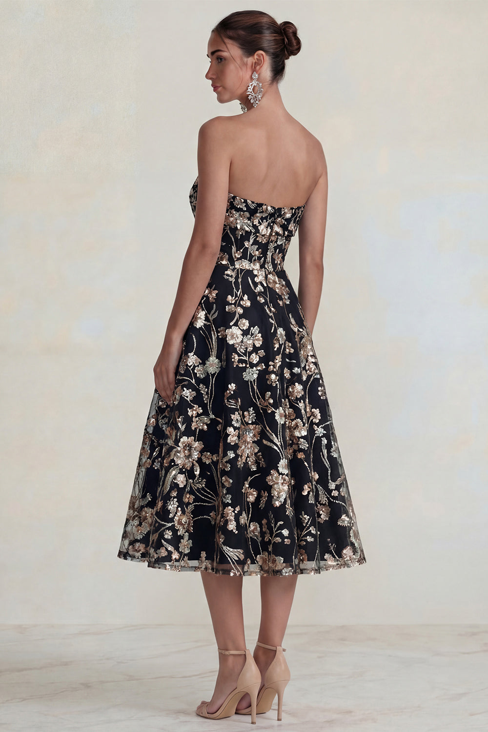 Błyszcząca różowa Sukienka Na Wesele midi bez ramiączek kwiatowymi