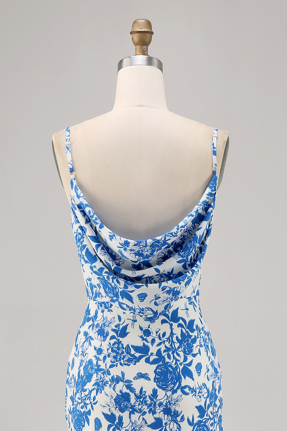 Długa suknia na ślubne goście z niebieskimi kwiatami i długimi ramiączkami w pochwę