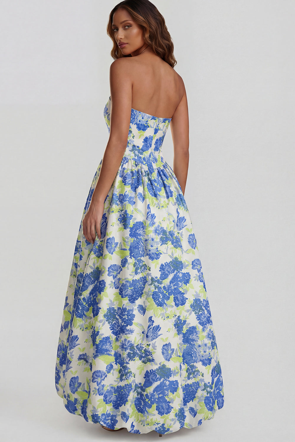 Niebieska sukienka midi bez ramiączek w kształcie kwiatu żonkinga i rozcięcia
