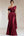 Bordowa satynowa sukienka galowa z odkrytymi ramionami i rozcięciem