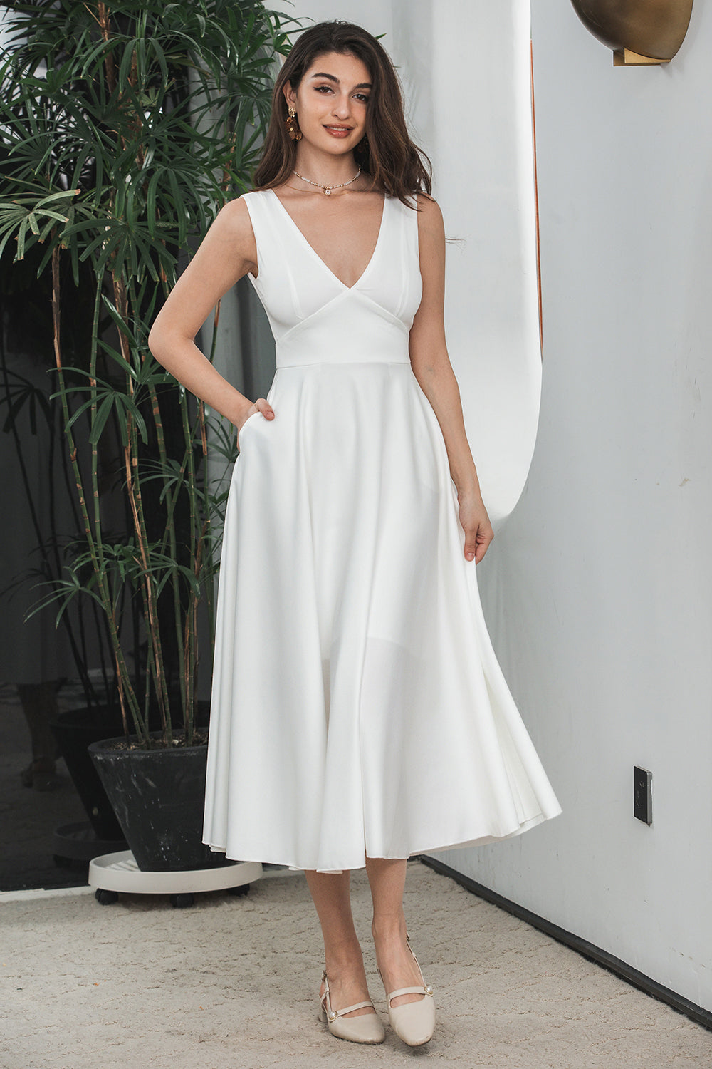 Dekolt V Biała Bez Rękawów Sukienki Na Wesele z Kieszenie