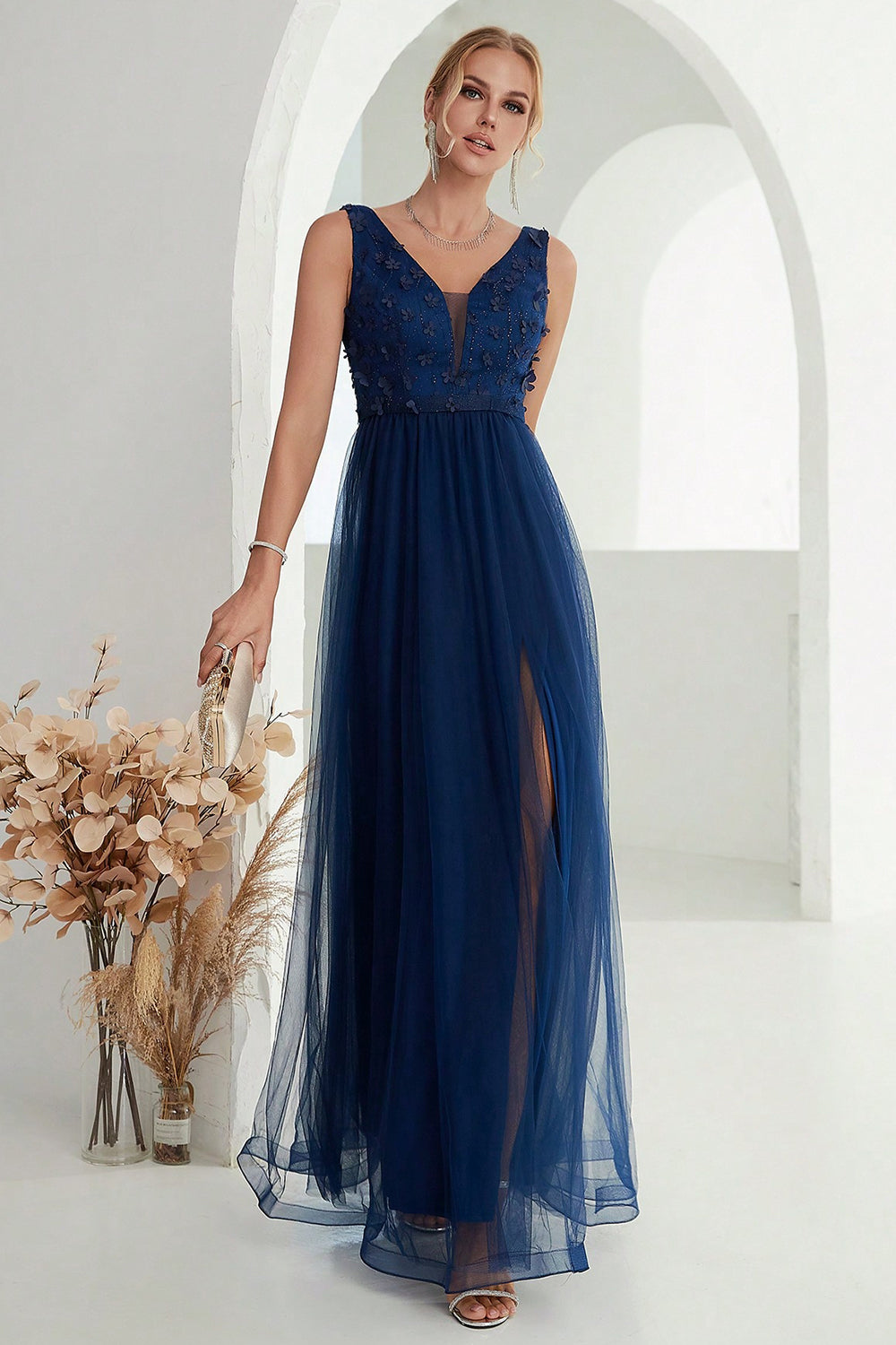 Granatowa Tiulowa Długa Sukienka Wizytowa Z Rozcięciem w Kształcie Litery A